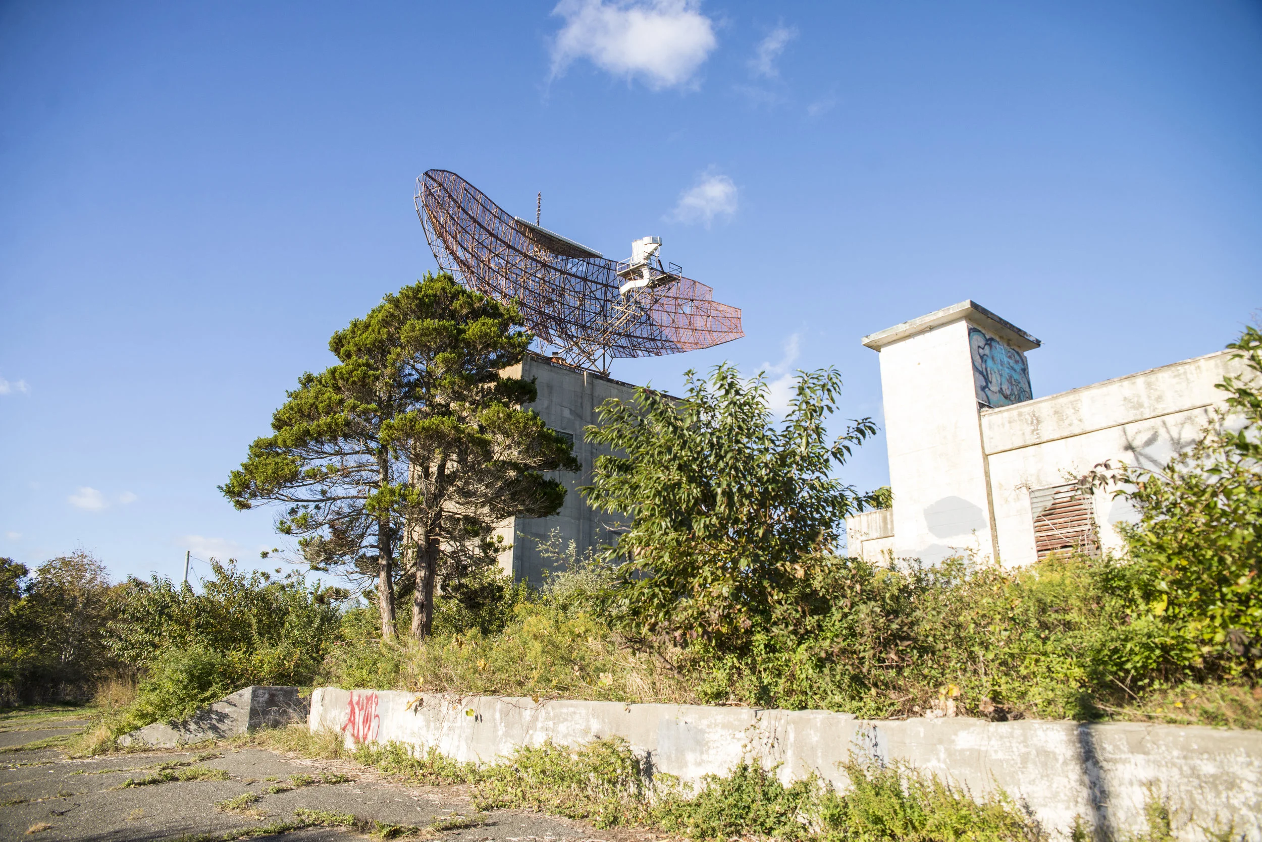 Guided by flashlights, we find some stairs and go up. The stairs begin to disappear and by the time we get to the top, the last two flights of stairs are gone. They had rusted and fallen into the darkness below. Manny and I make it to the top by climbing the wall and the rusty railing. When we get to the roof, the radar is so big we can’t even get a photo of it. We crawl to the edge to enjoy the view, but see a golf cart below. Is it security? Some kind of scout calling for reinforcements? Am I going to jail again? I turn to Manny in a panic, looking for answers, but his answer is “Be a model!” We just laugh and I take his picture posing with the gigantic radar before we get the fawk out of there. We run like wild donkeys in slow motion and hop to the legal side of the fence. Our smiling eyes agree we got away with something stupid.